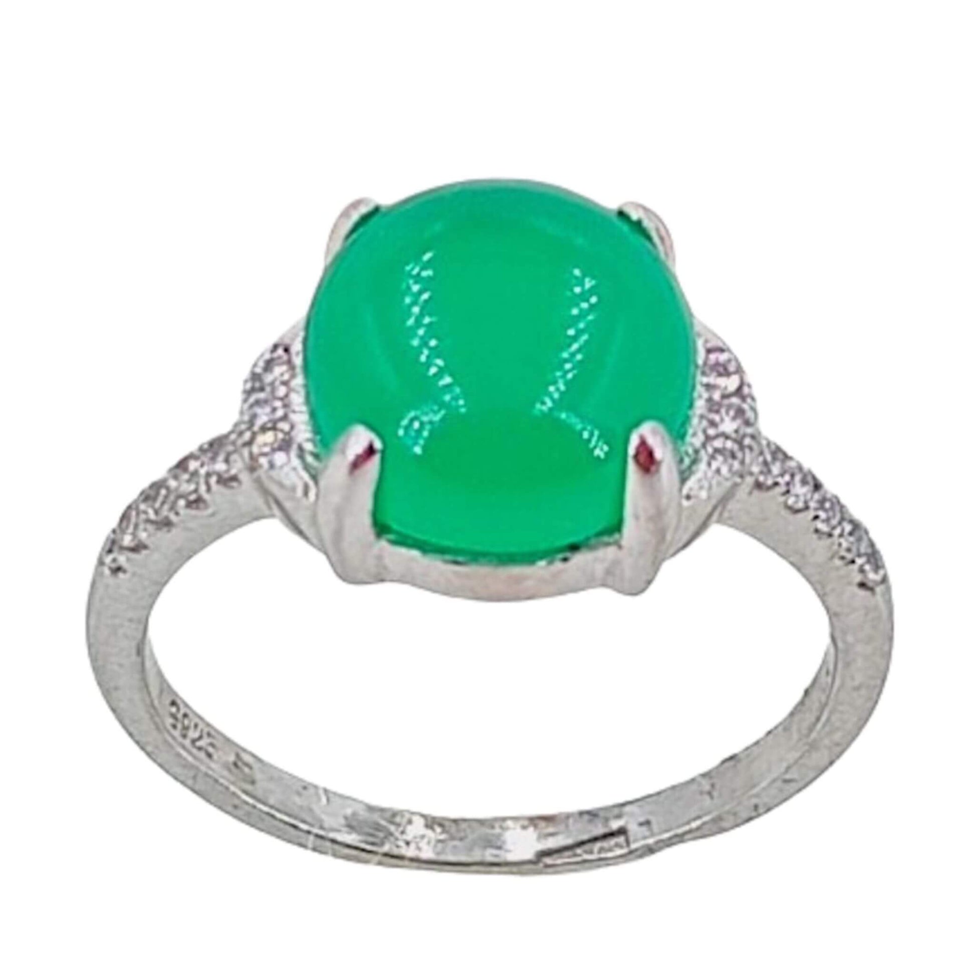 - Circonitas Adicionales: Circonitas blancas a ambos lados de la piedra verde, que realzan el brillo del anillo y le añaden un contraste sofisticado.