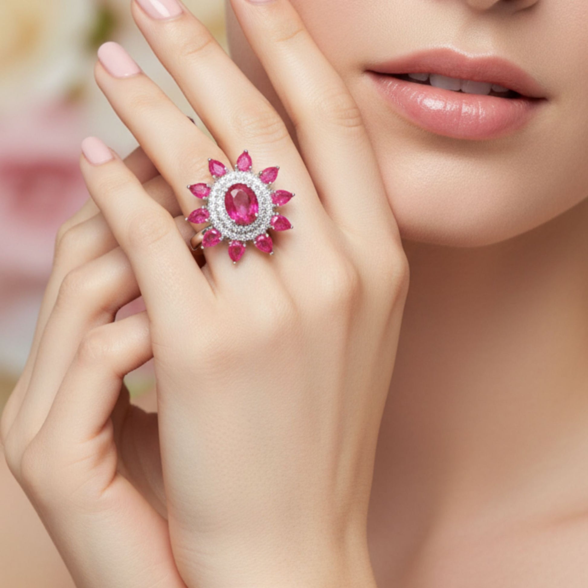 Este anillo de plata con acabado en rodio destaca por su elegante diseño, con una impresionante circonita roja central de 8x6 mm rodeada por circonitas blancas y rojas que aportan un brillo deslumbrante. Ideal para ocasiones especiales, este anillo es una pieza de glamour que seguramente captará la atención y añadirá un toque sofisticado a cualquier conjunto.