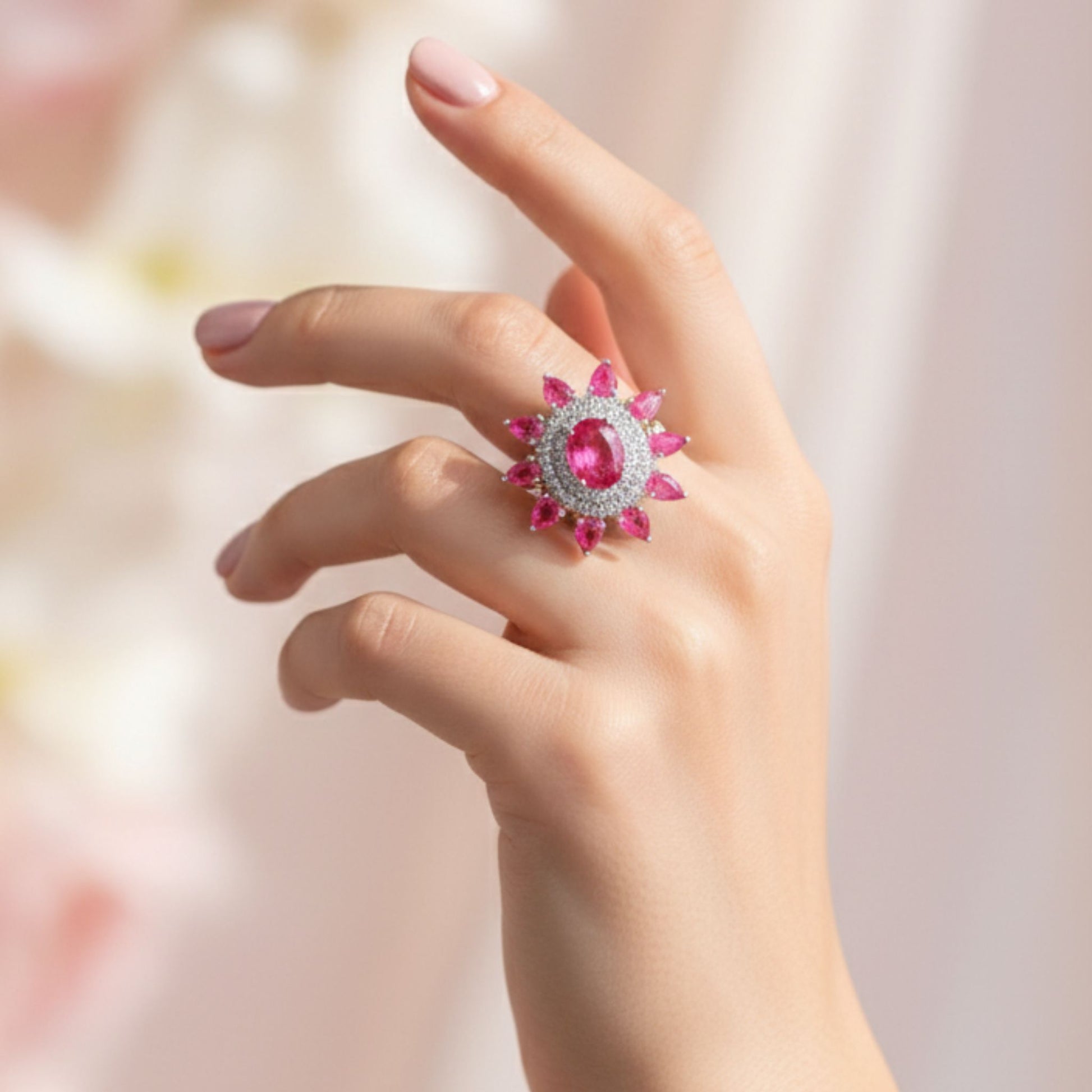 - Piedras: Circonita roja central de 8x6 mm, acompañada de circonitas blancas y rojas