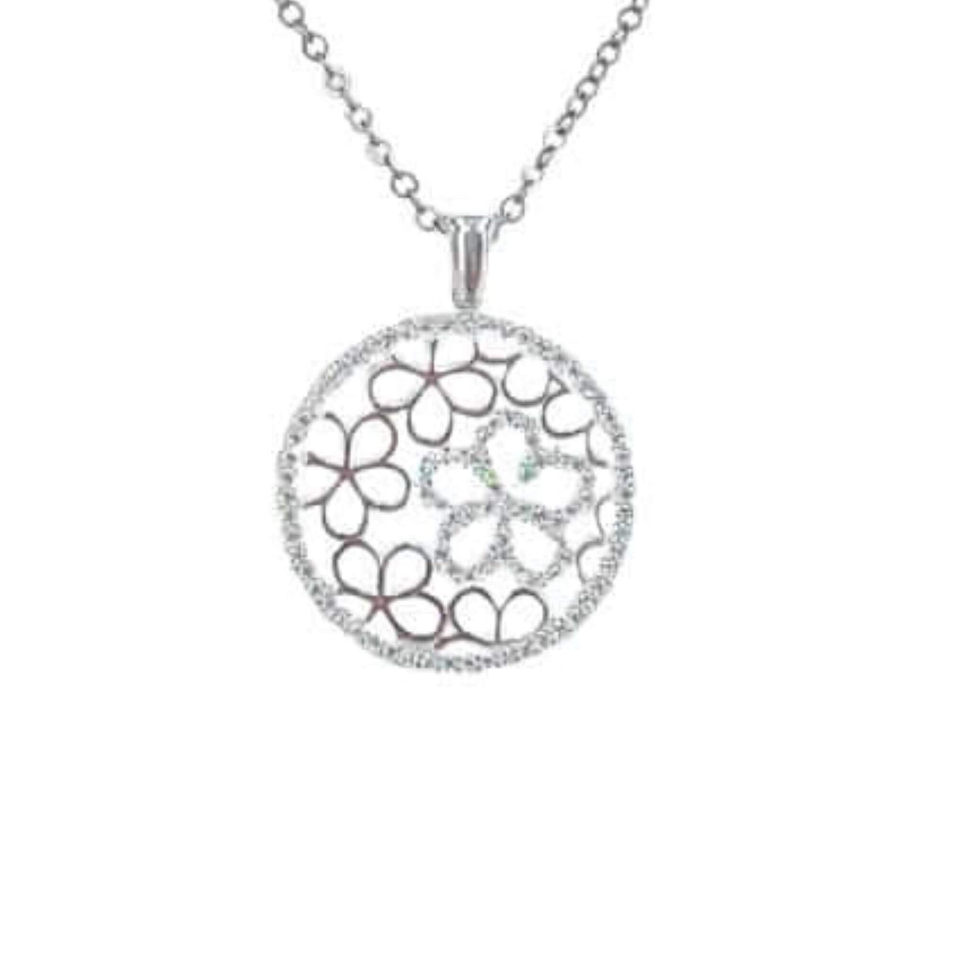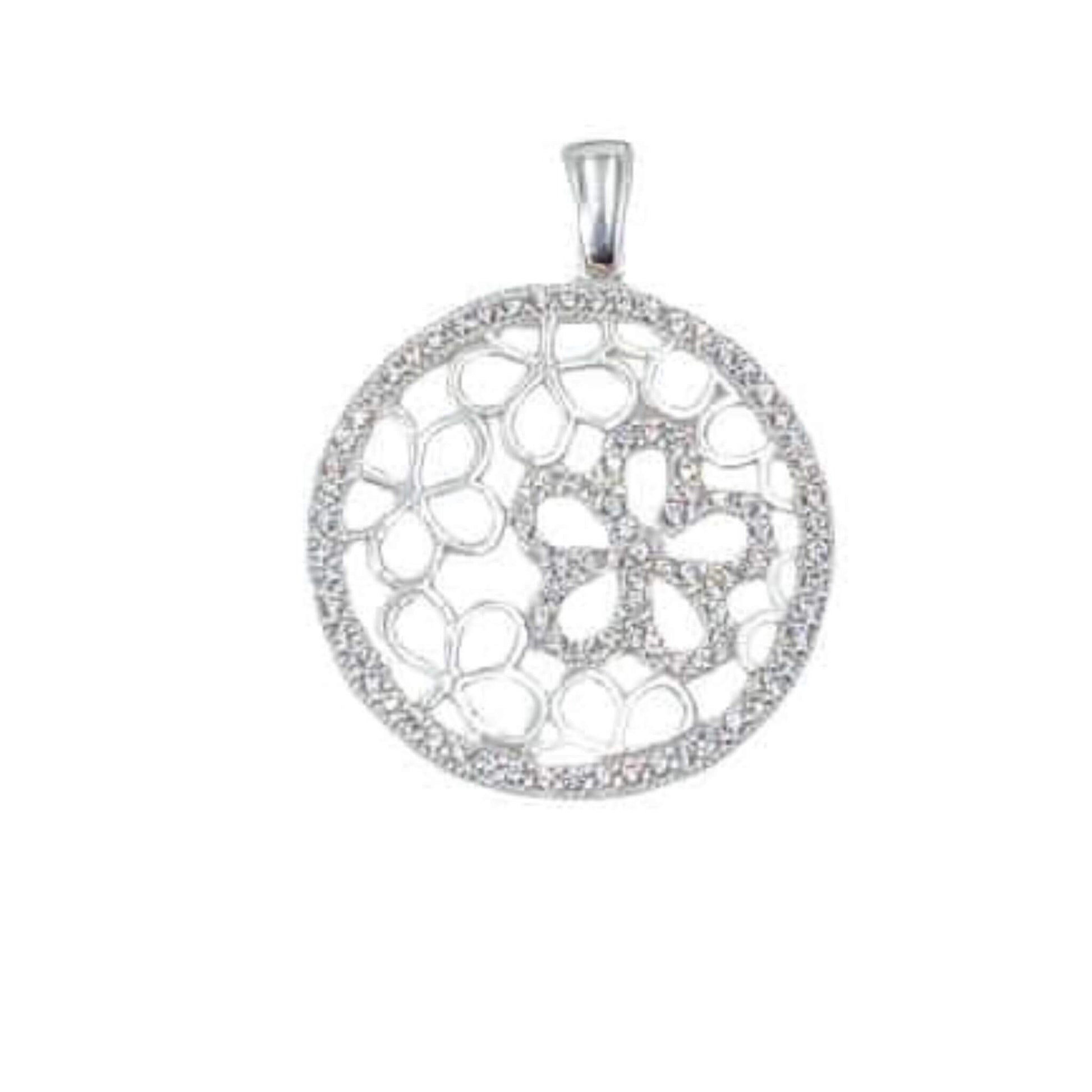 Colgante de plata 925 con acabado en rodio, diseñado para mujer. El colgante tiene un diámetro de 25 mm y presenta un diseño de flor calada con detalles lisos y decorado con circonitas blancas. La cadena es opcional, por lo que puedes elegir si deseas añadirla o no.