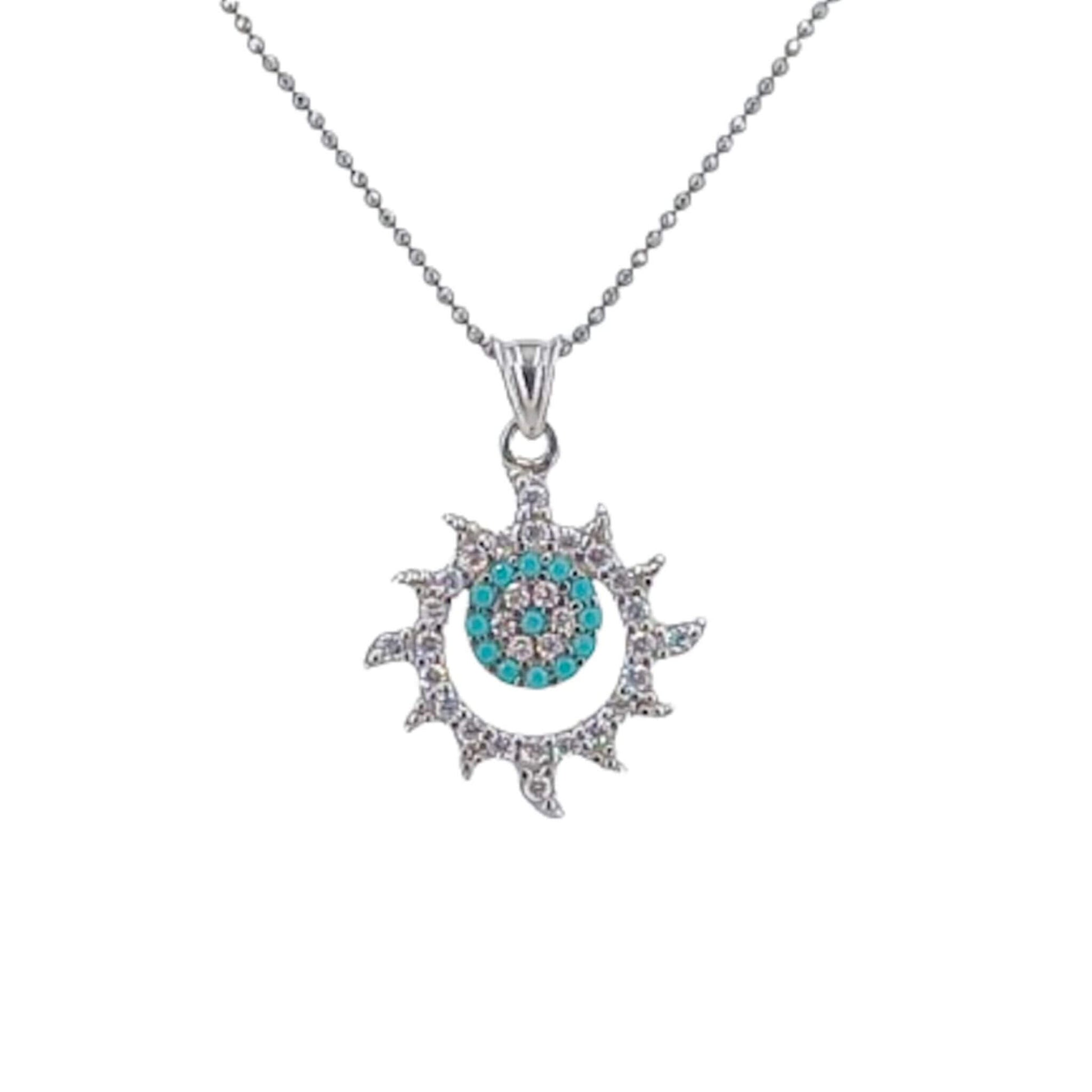 COLGANTE SOL PLATA ACABADO EN RODIO ,CIRCONITAS Y TURQUESAS
