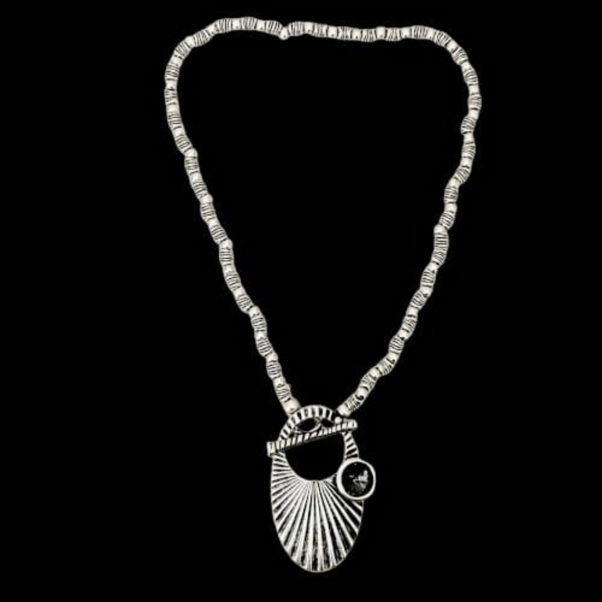 Destaca con este elegante collar que combina una cadena texturizada con un espectacular colgante en forma de abanico. El detalle de circonita redonda añade un toque de brillo y sofisticación.