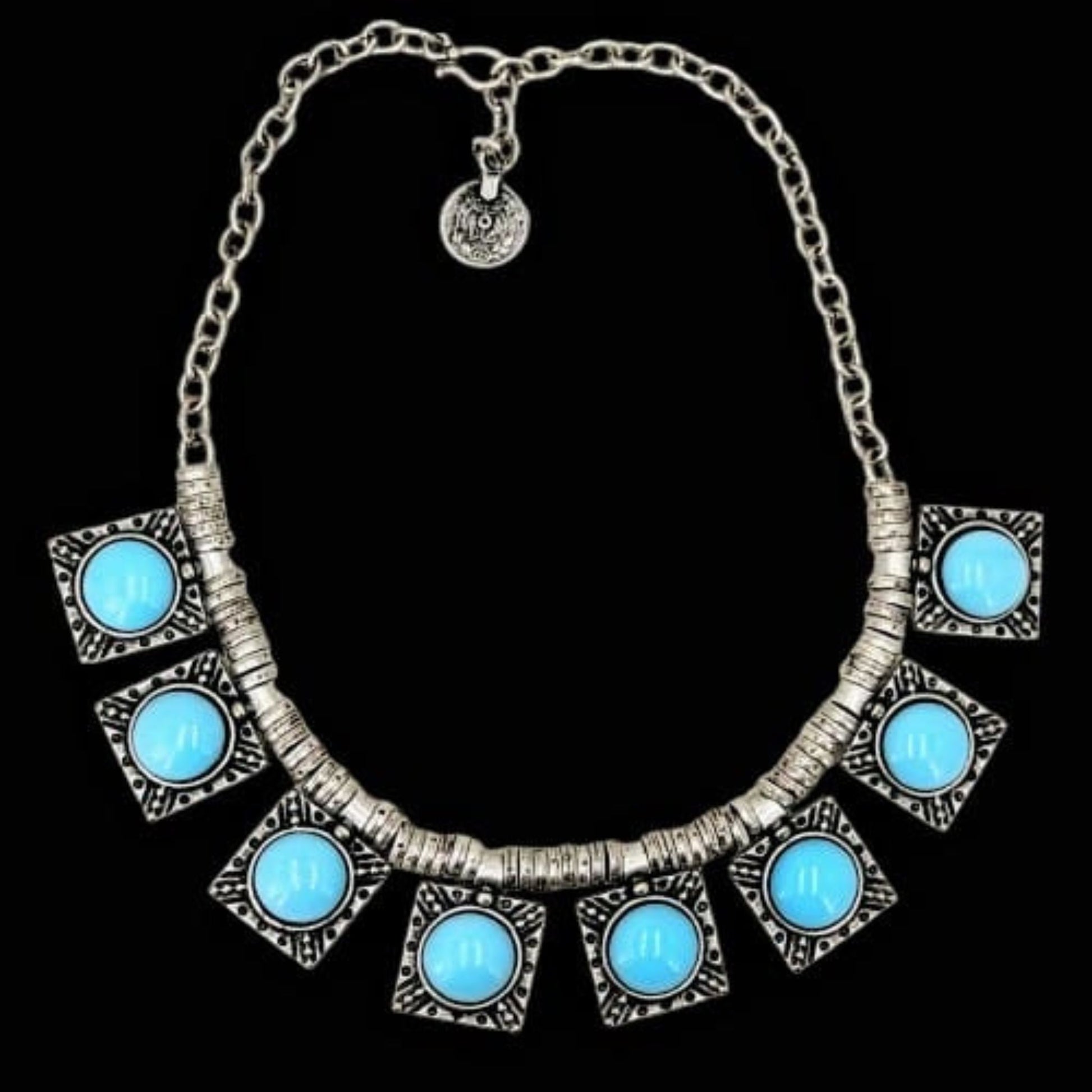 Descubre la magia de este collar único que fusiona el estilo vintage con la energía protectora de la turquesa. Sus 8 medallones cuadrados con incrustaciones de turquesa crean una composición armoniosa que evoca la elegancia atemporal de esta joya.