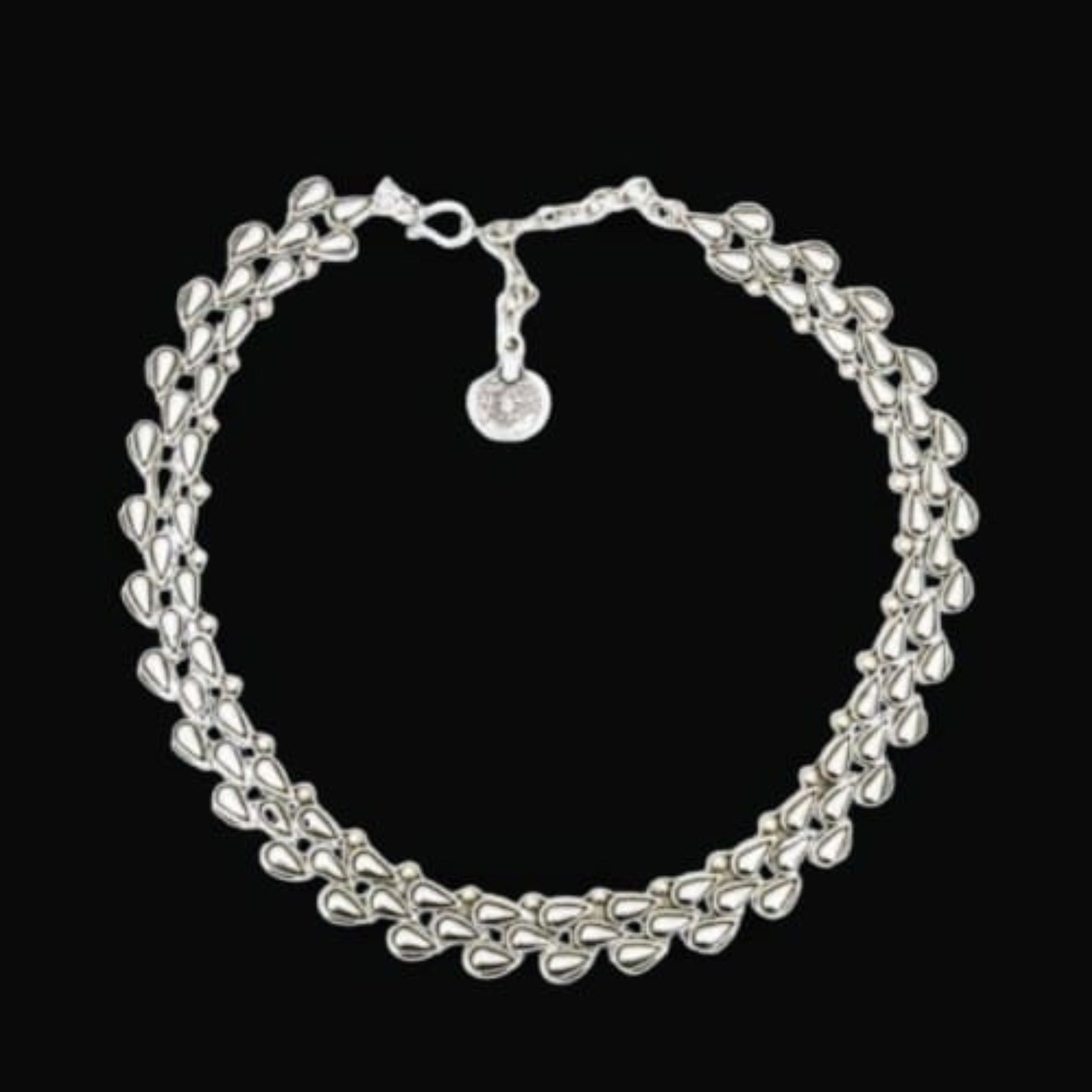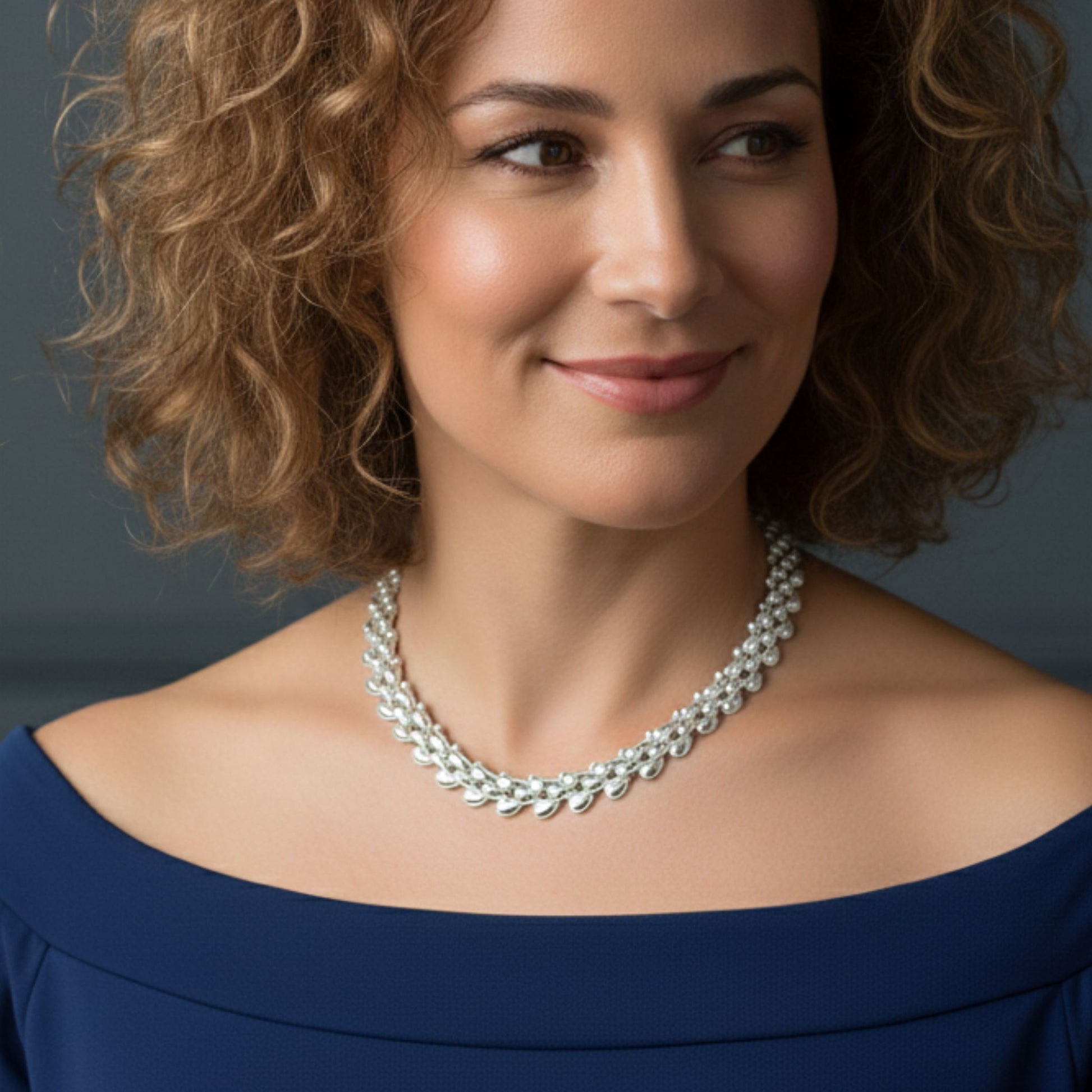 Este collar Zamak con eslabones entrelazados en forma de herradura crea un efecto visual de lluvia plateada que captura todas las miradas. Un diseño arquitectónico que transforma lo simple en extraordinario.
