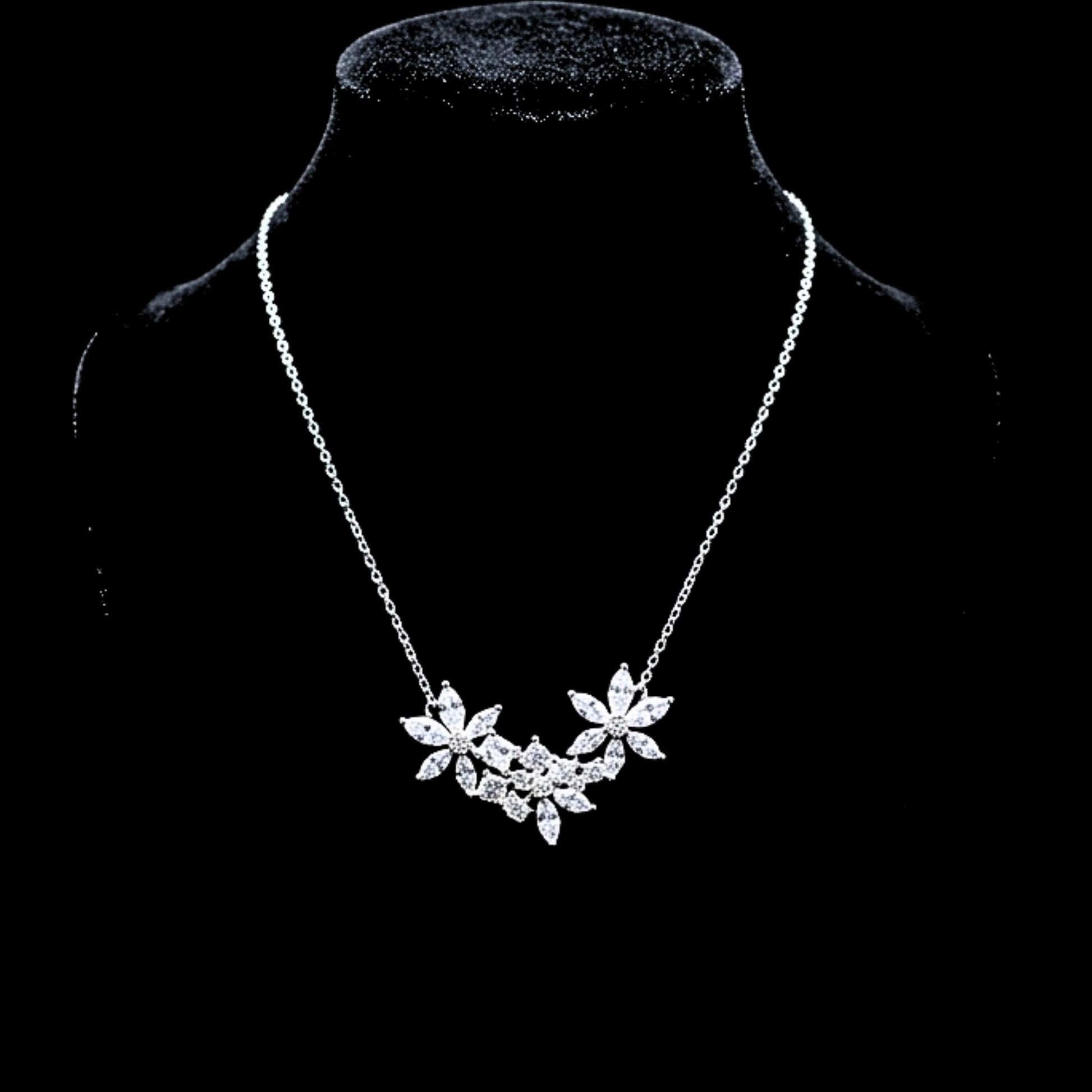 Déjate envolver por la delicadeza de este collar de flores en acero inoxidable plateado, diseñado para quienes buscan un toque de lujo y sofisticación. Sus circonitas engastadas de máxima calidad capturan la luz con cada movimiento, creando un efecto brillante y glamuroso que enamora a primera vista.