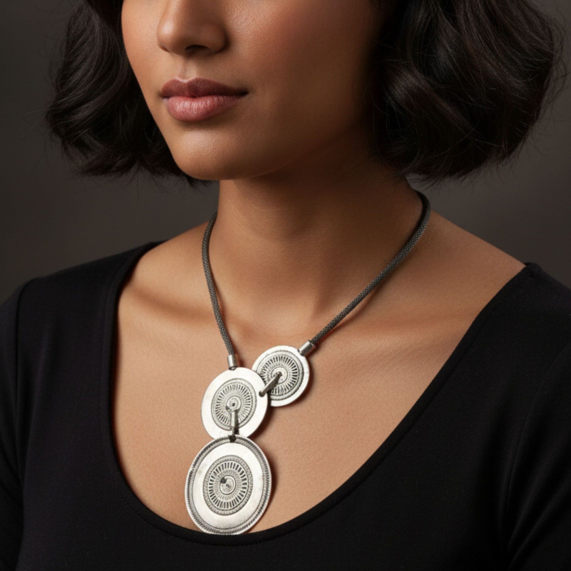 Este collar Zamak con colgante de círculos concéntricos es arte portátil. Su diseño tribal-contemporáneo con tres medallones grabados crea un impacto visual imposible de ignorar.