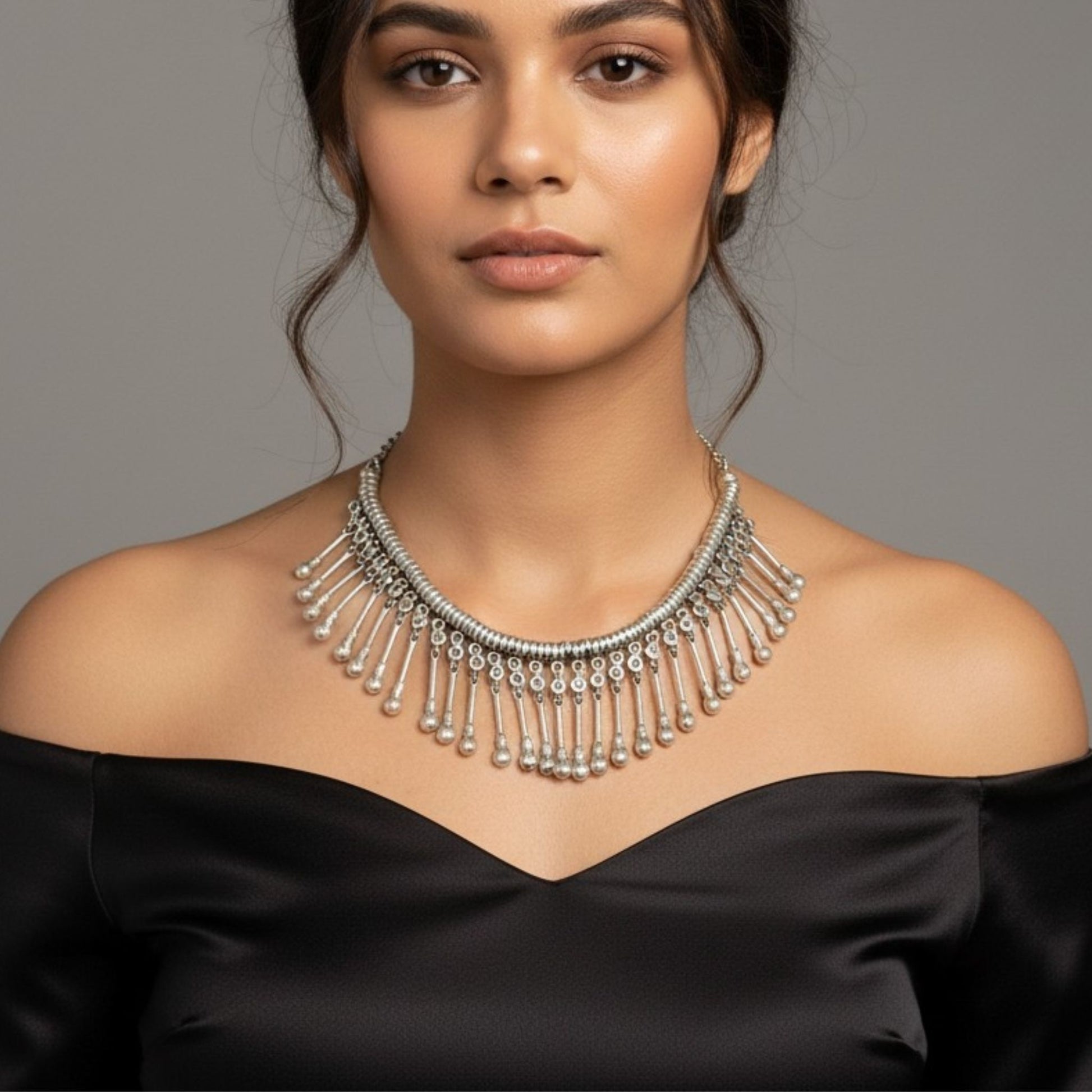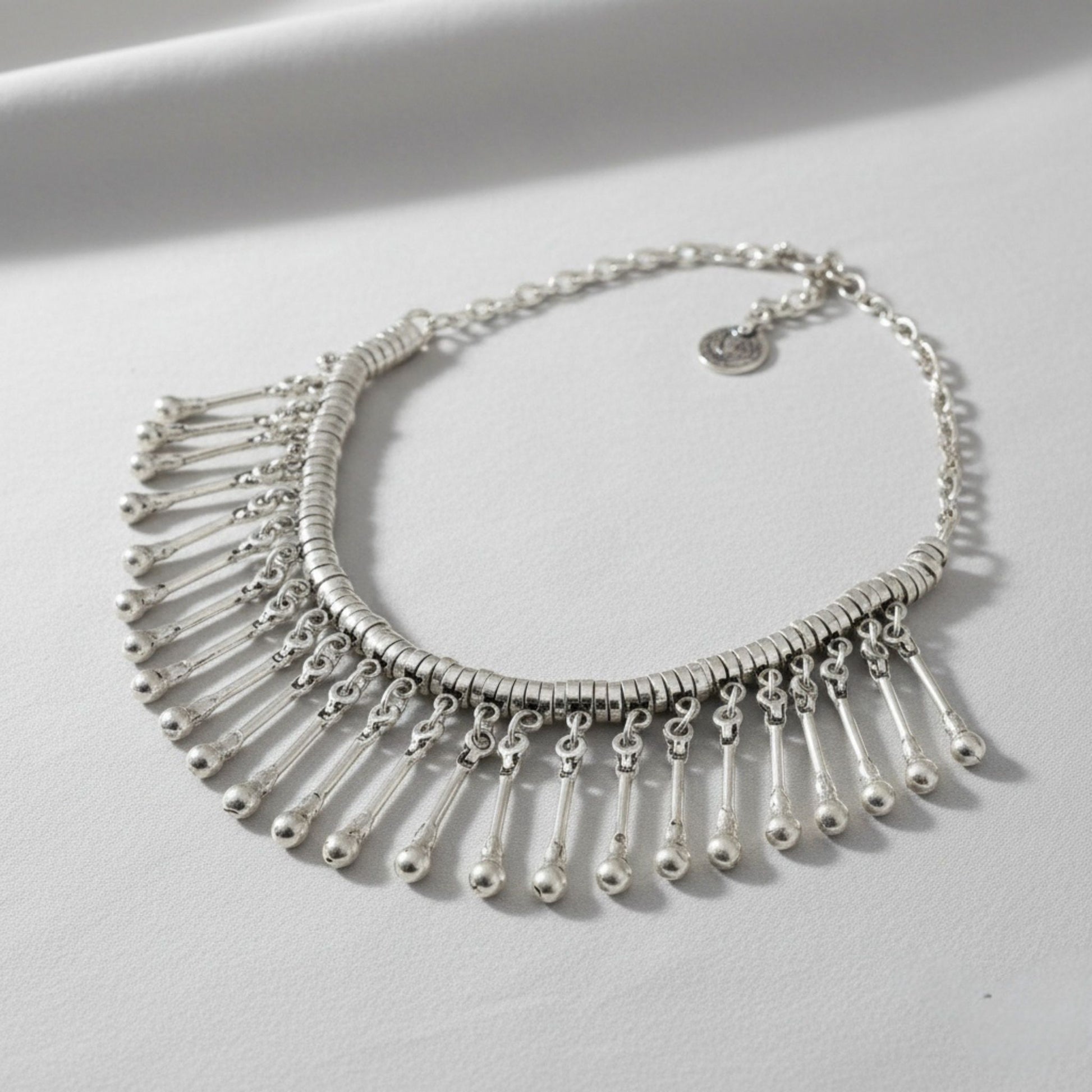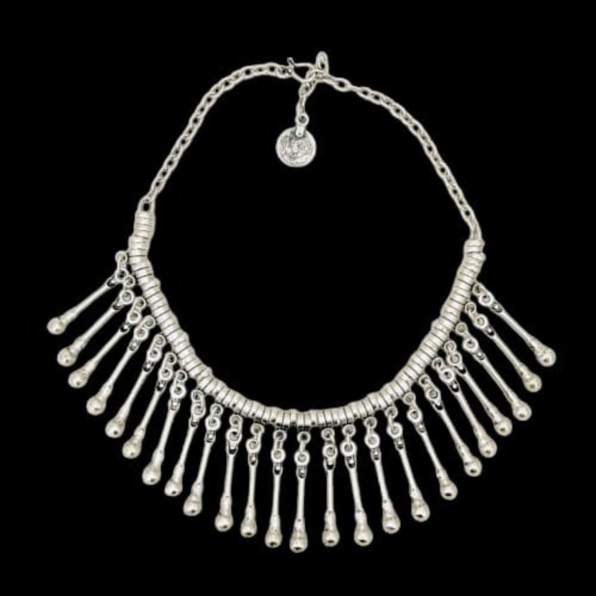 Este collar Zamak con flecos en cascada es pura elegancia dramática. Su diseño de varillas plateadas con bolitas colgantes crea un efecto visual espectacular, cada movimiento hace que los flecos bailen y capturen la luz, creando destellos plateados que hipnotizan.