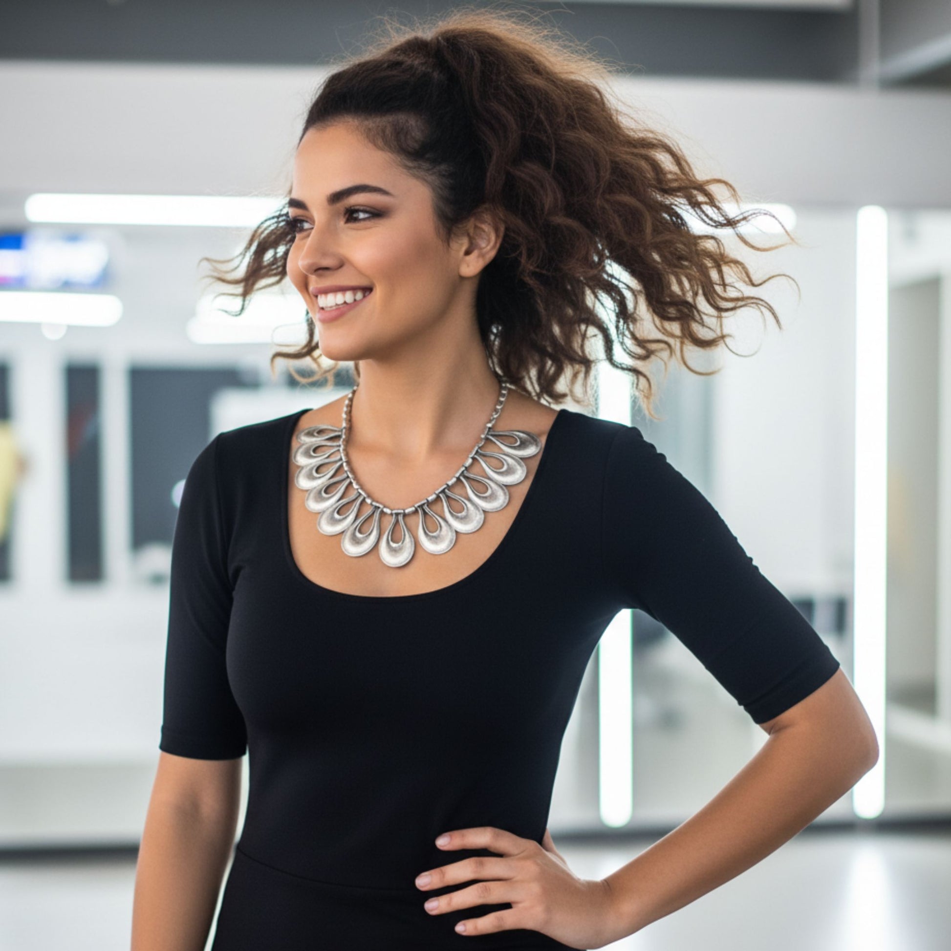 Este collar presenta un diseño único con múltiples pétalos curvos que crean un efecto visual hipnotizante. Fabricado en zamak de alta calidad con acabado plateado mate-brillante. Con 40cm ajustable hasta 48cm y 40mm de ancho, es una pieza que combina volumen con elegancia. Antialérgico y perfecto para pieles sensibles. Pétalos metálicos en forma de gota que se despliegan como un abanico de sofisticación alrededor de tu cuello.