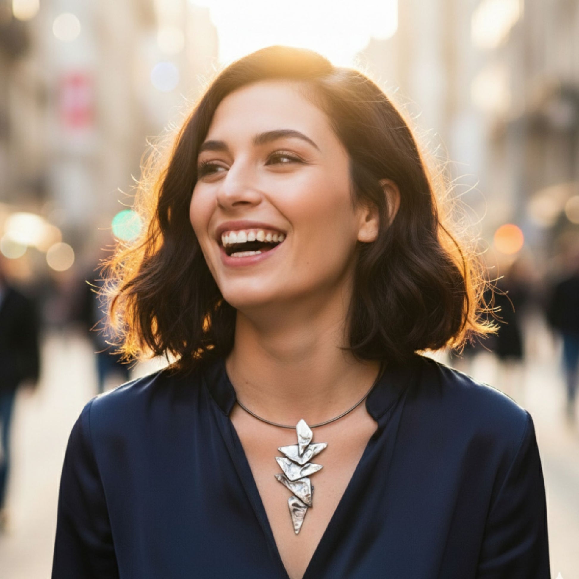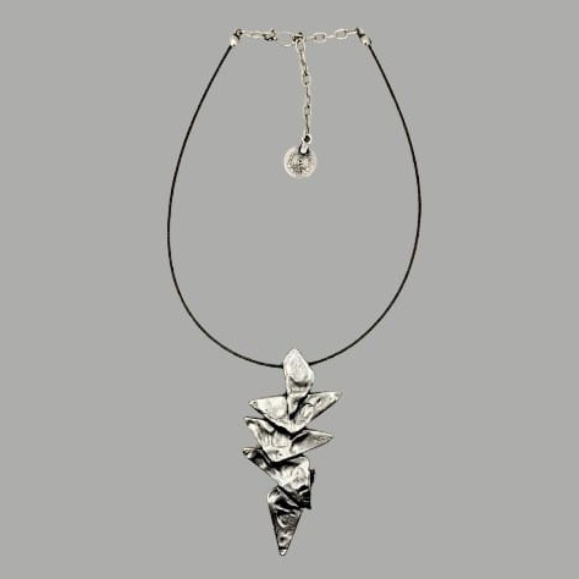 ✨ Un diseño que fusiona geometría y movimiento. Las capas superpuestas del colgante crean un efecto tridimensional, mientras que su forma puntiaguda aporta un toque contemporáneo y atrevido. El diseño minimalista del cordón permite que la pieza central sea la protagonista absoluta.