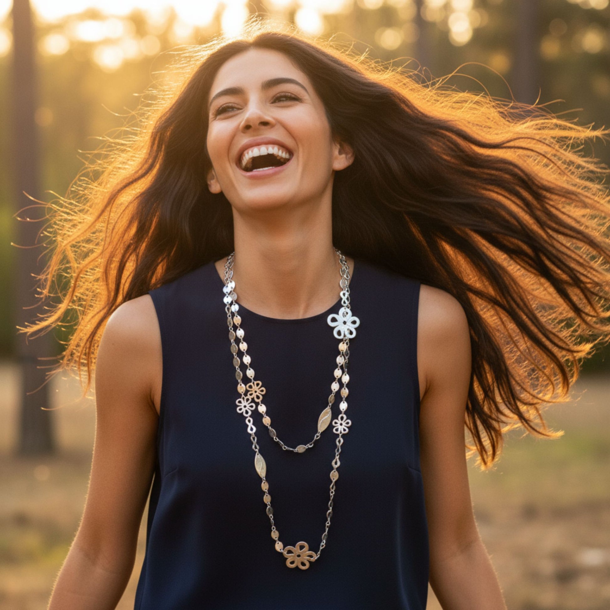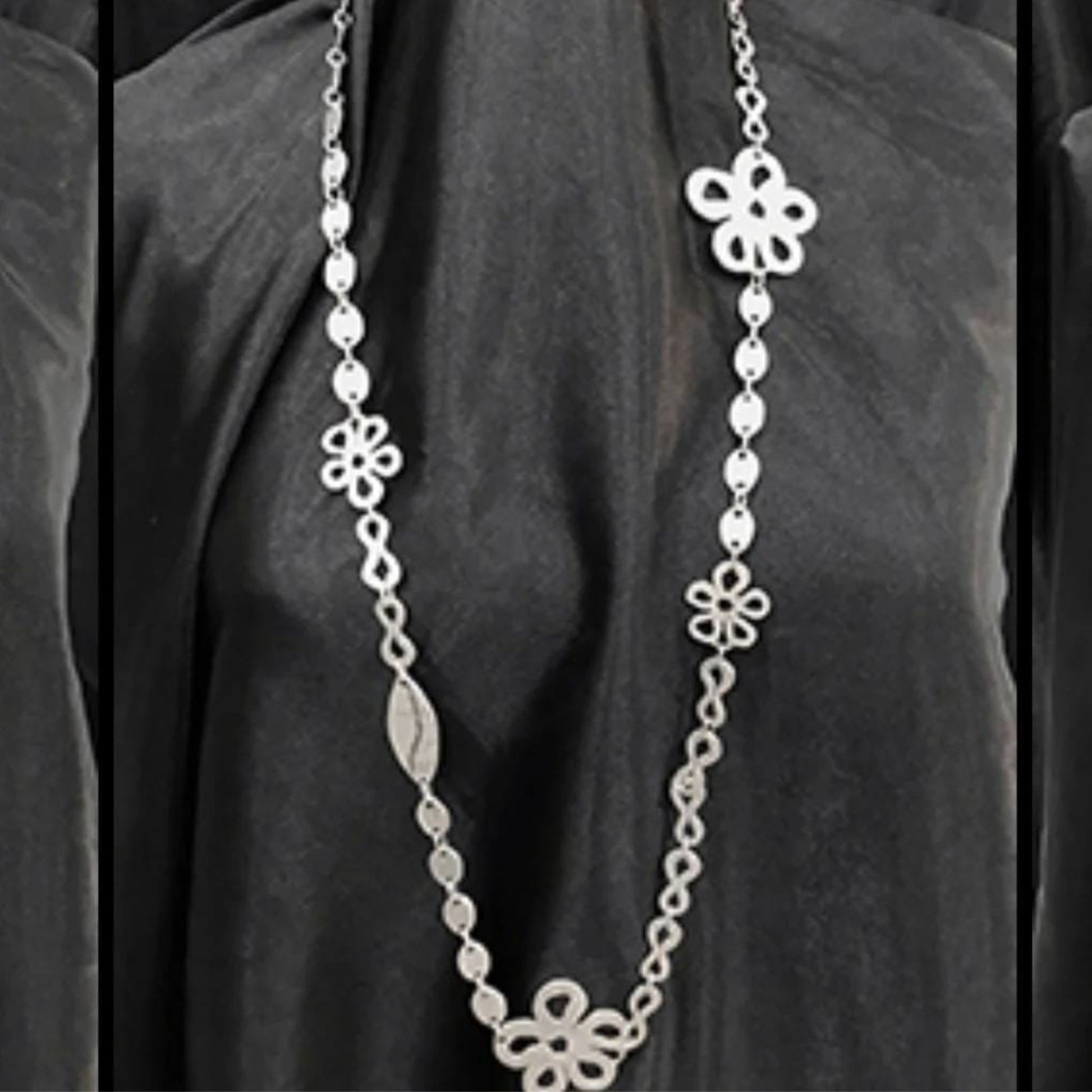 Descubre este collar largo de zamak plateado con delicados tréboles calados, una pieza que destaca por su diseño sofisticado y su longitud versátil de 90cm. Un colgante delicado que une el Infinito (símbolo de amor sin fin), con el Trébol de 5 hojas (fortuna, prosperidad y protección).