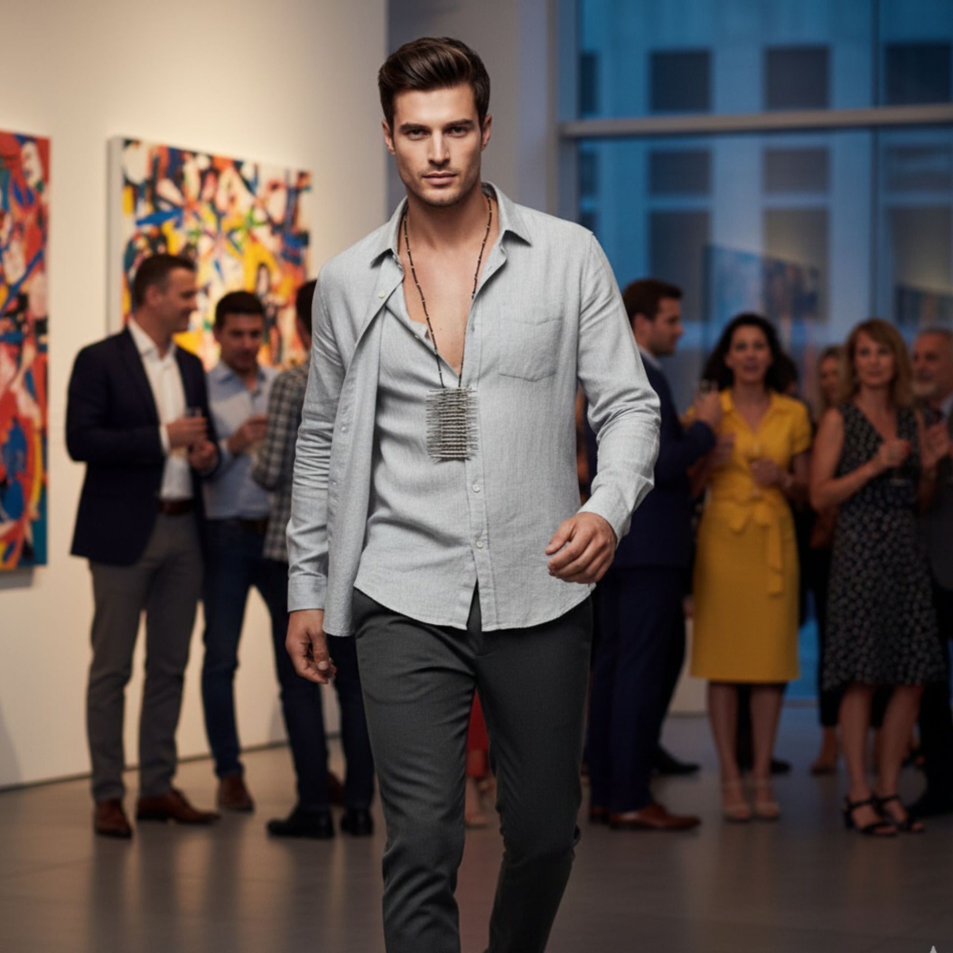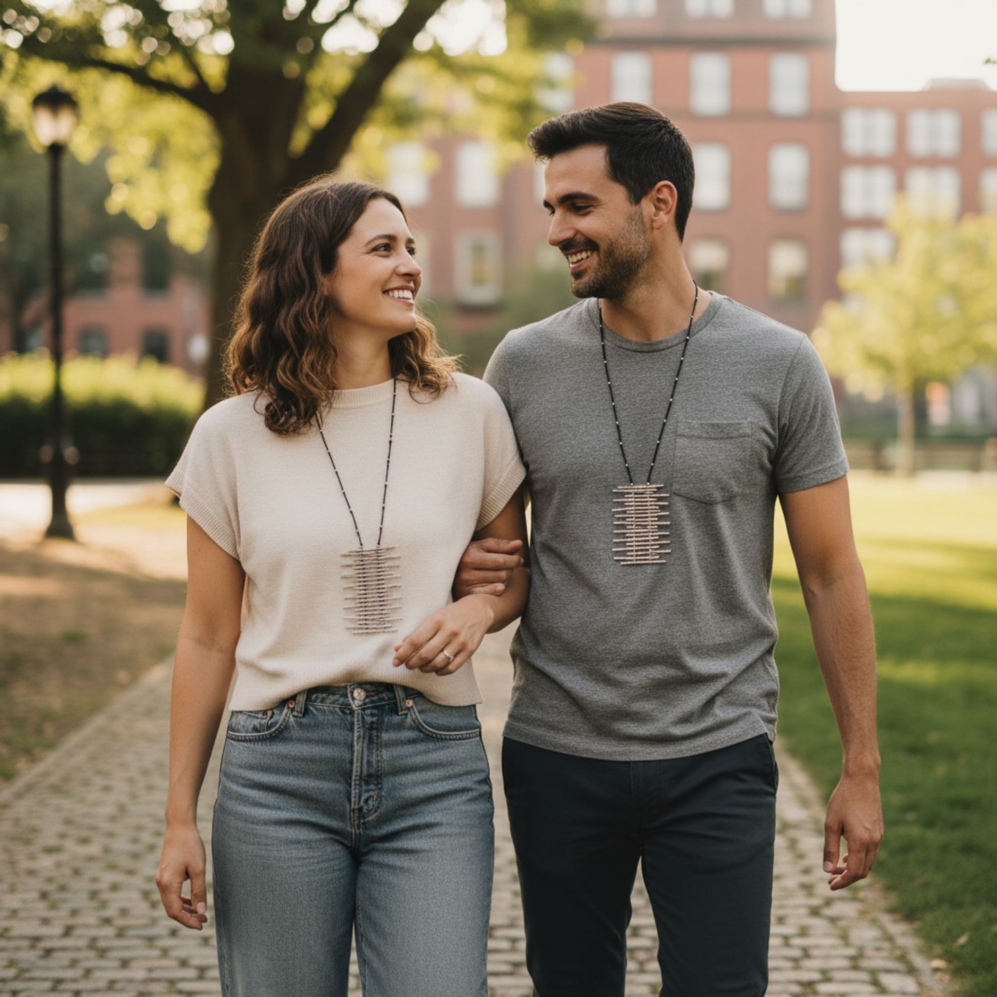 💎 Este collar statement combina diseño contemporáneo con versatilidad unisex. Las barras horizontales en zamak plateado crean un juego visual dinámico sobre cordón de hilo.
