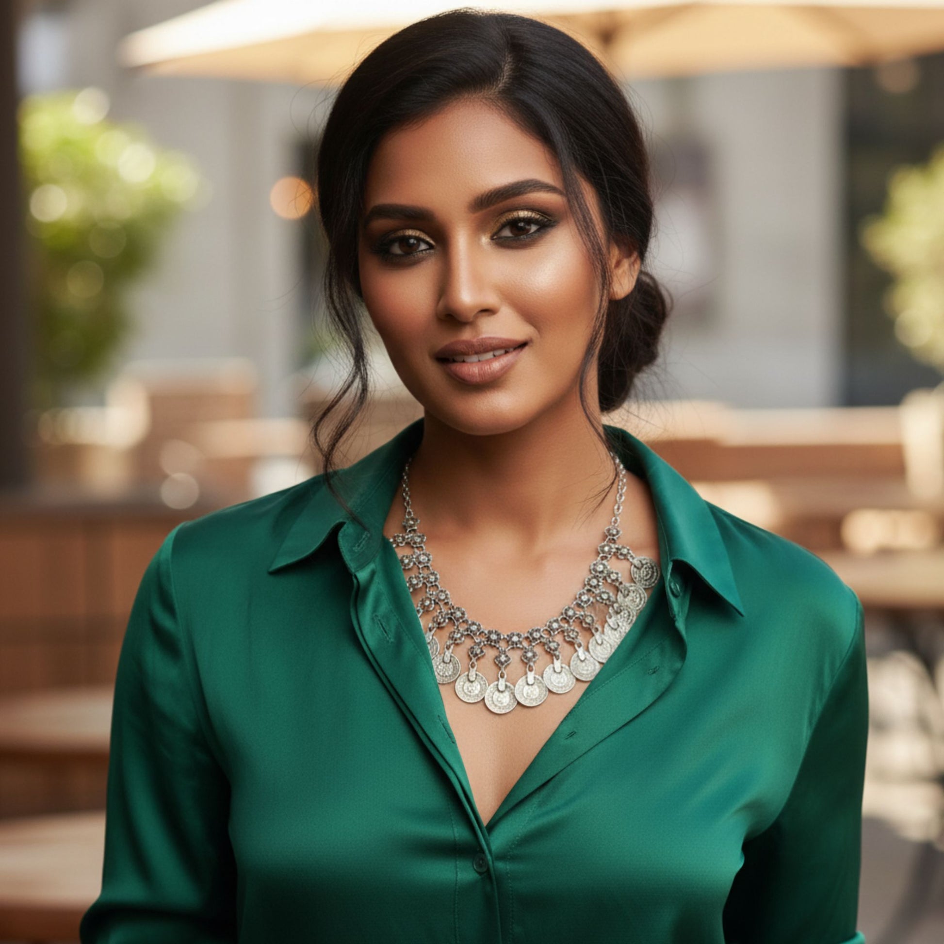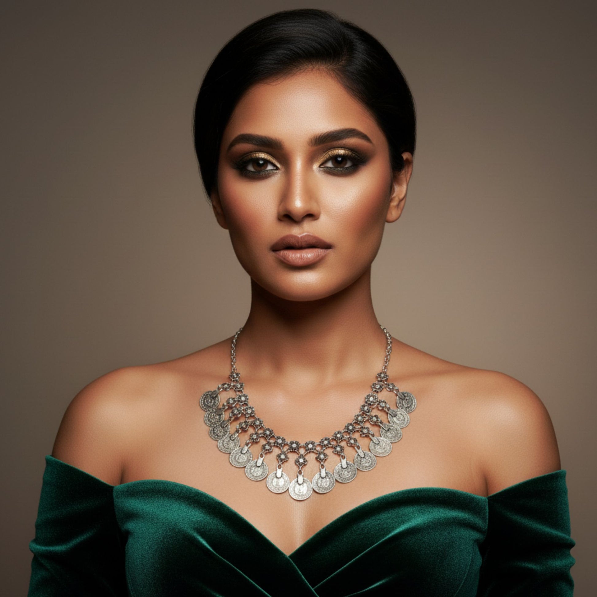 ✨ Un collar que no pasa desapercibido. Monedas vintage en zamak plateado que capturan la luz con cada movimiento.