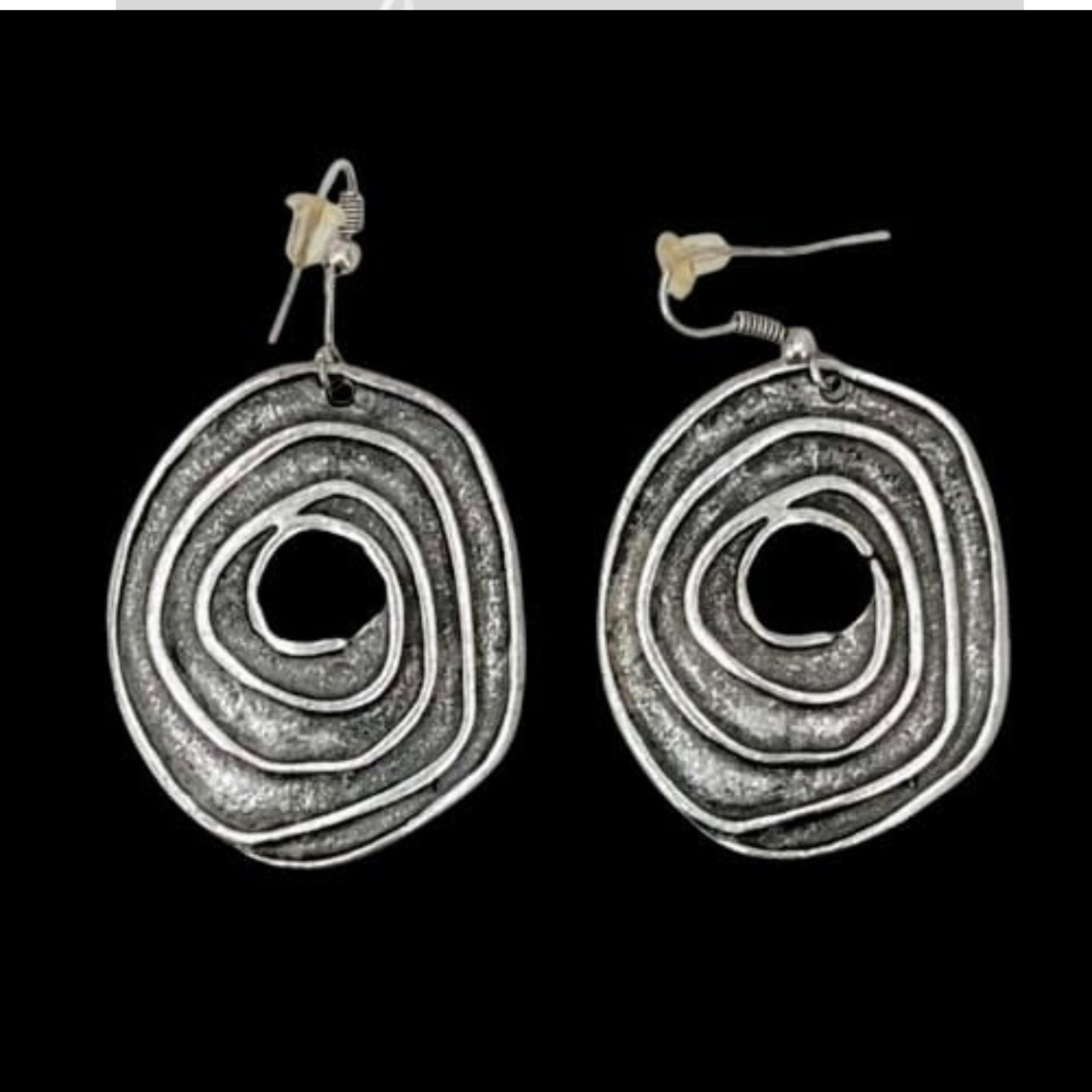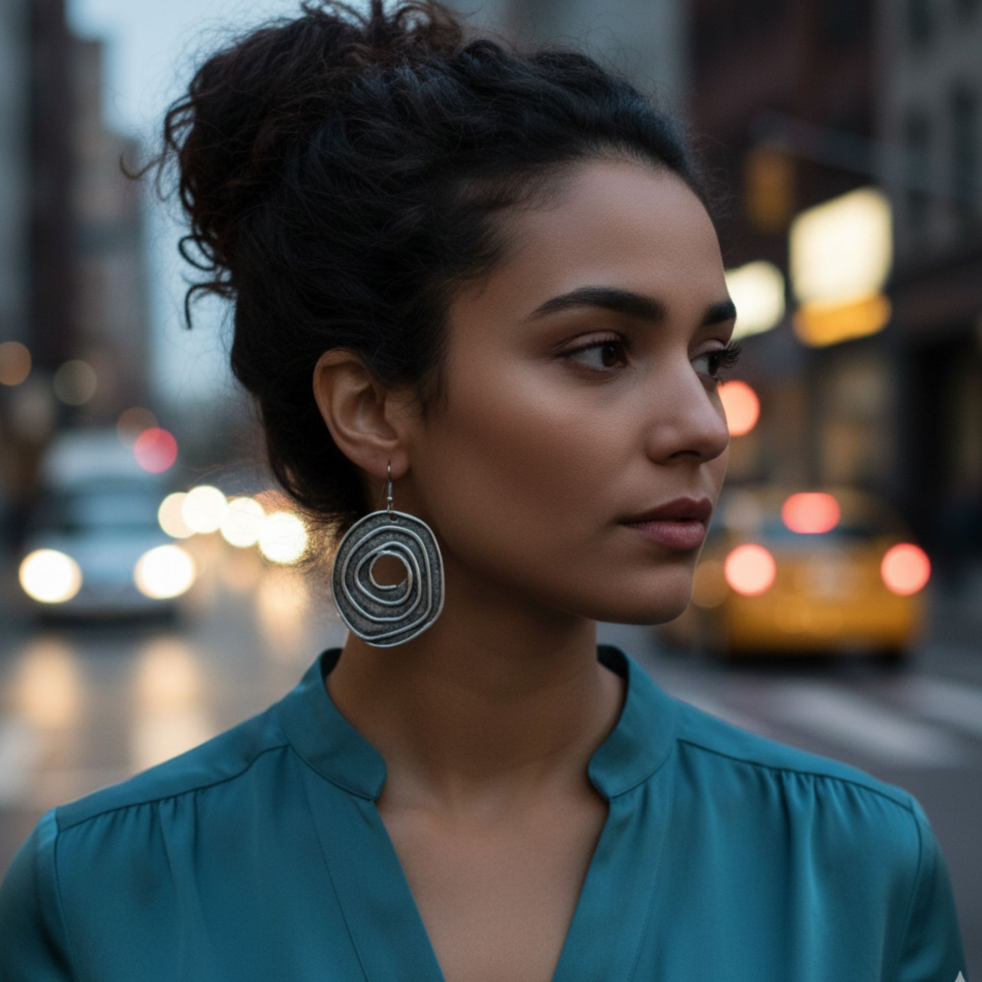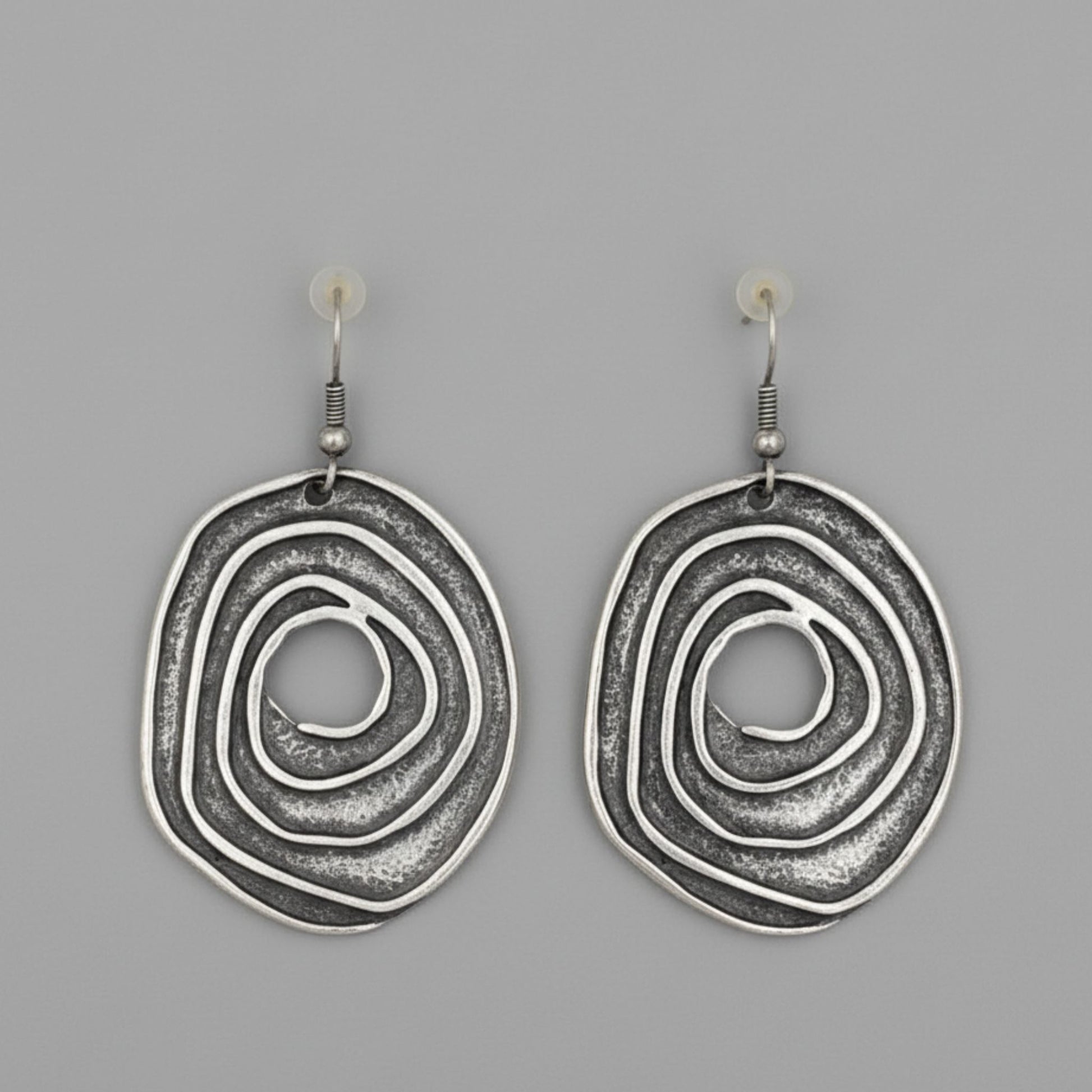 Descubre estos fascinantes pendientes de zamak plateado con diseño de espiral envolvente. Un efecto visual cautivador que combina geometría orgánica con textura martillada.